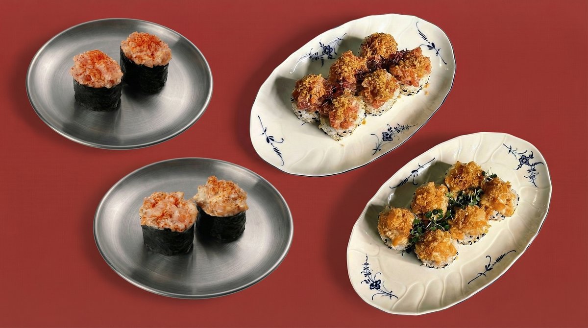 Spicy salmon gunkan, spicy tuna gunkan, spicy salmon roll, spicy tuna roll