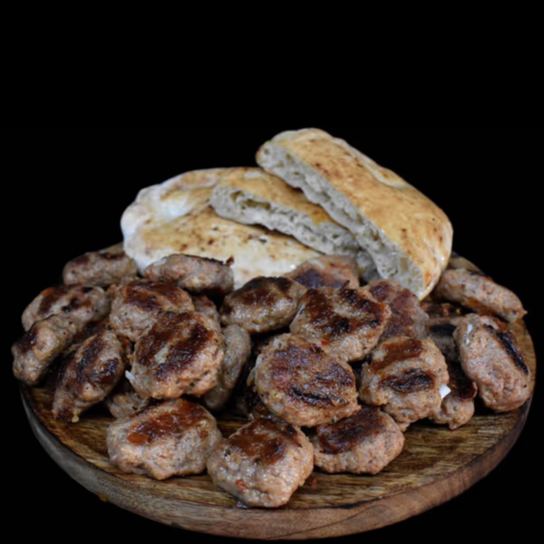 10 ćevapa, pojačana pljeskavica, uštipci, pileće belo meso, pileći batak, kobasica, luk, mešana salata, urnebes, pavlaka, 2 somuna