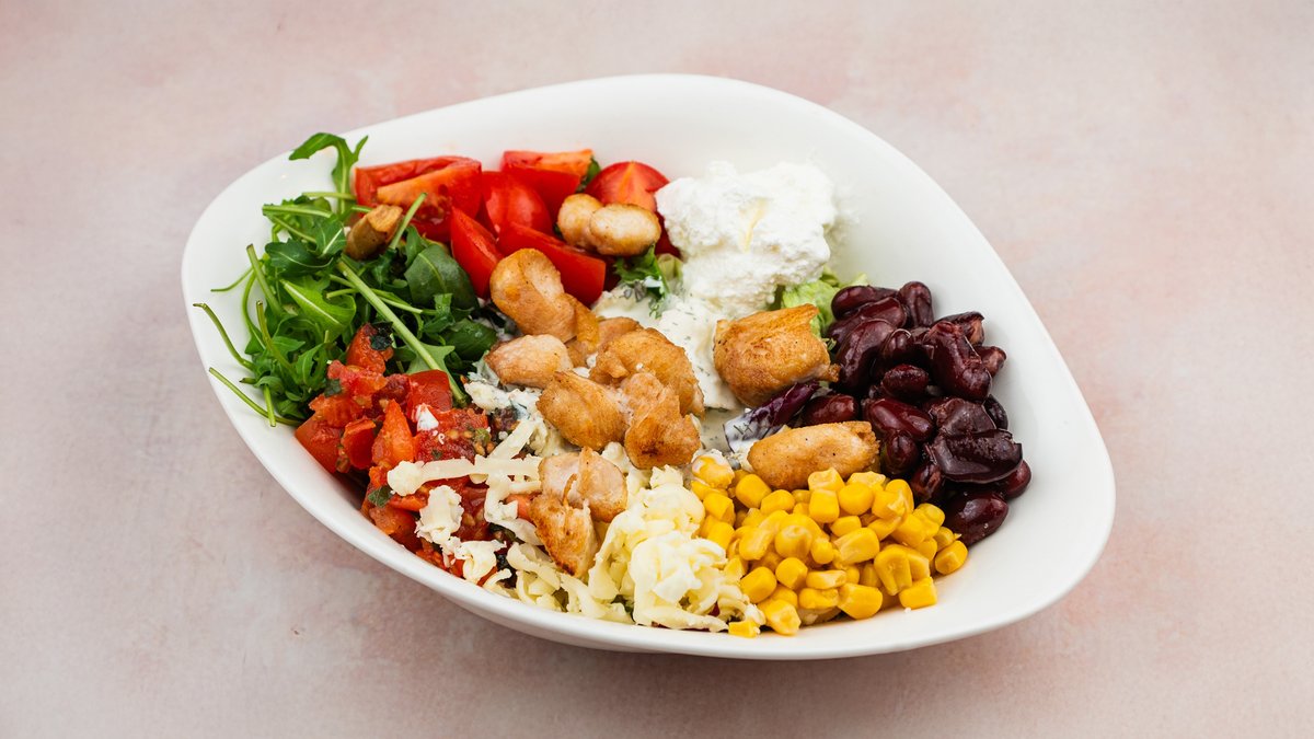 Grilovana pileća prsa 70g, mešane salate, rukola, kukuruz šećerac, crveni pasulj, čeri paradajz, maslinovo ulje, kisela pavlaka, paradajz mariniran u devičanskom maslinovom ulju sa belim lukom, mocarela, Ranč preliv.