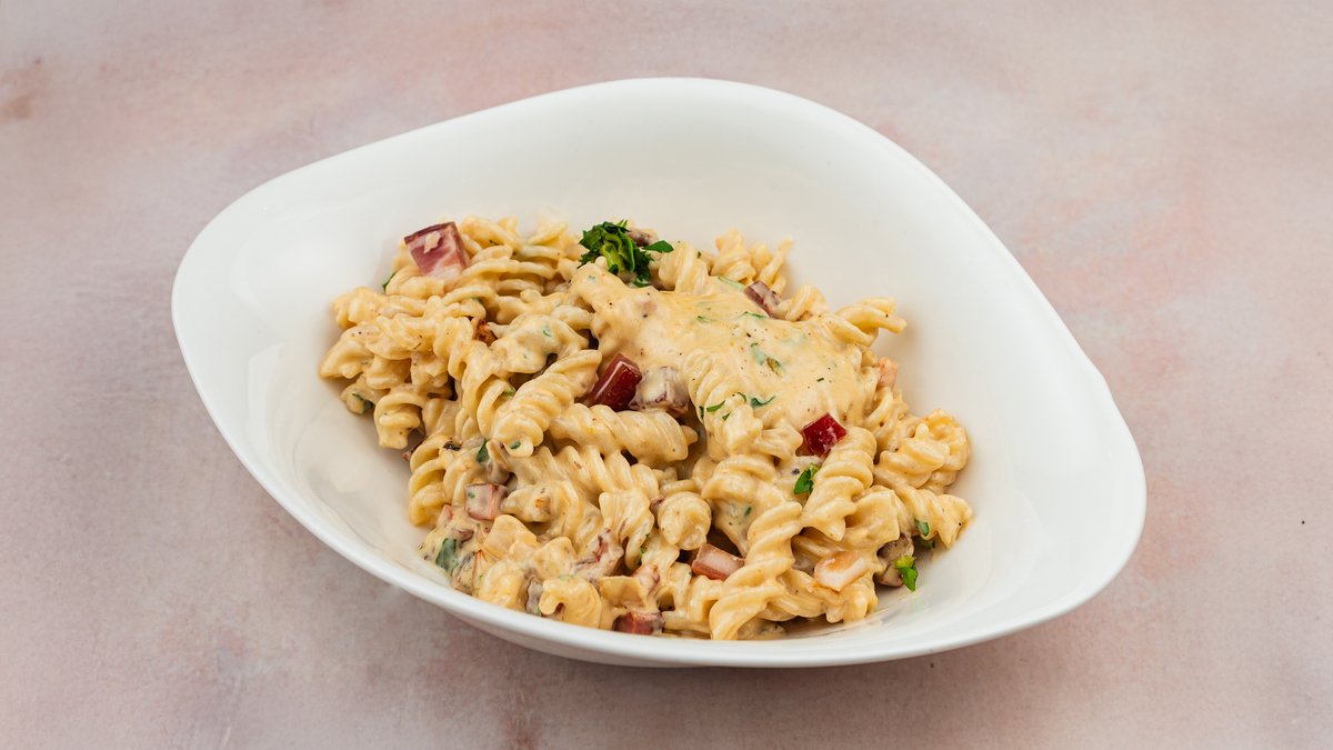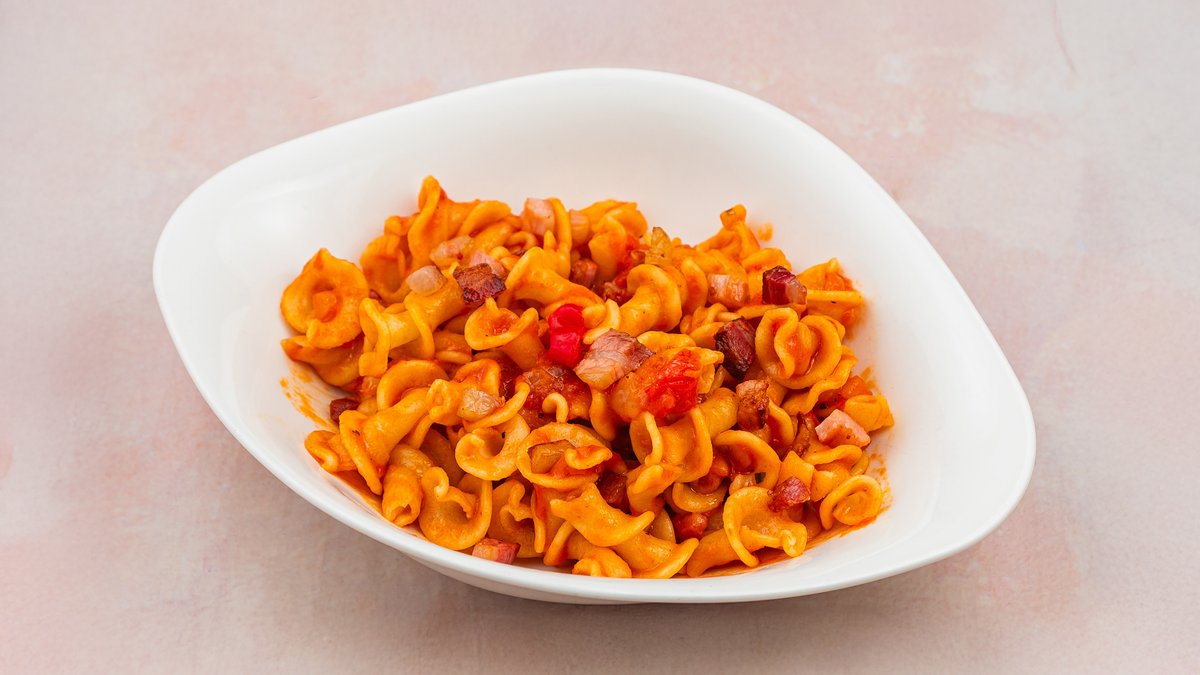 Njoke, dimljena pančeta, maslinovo ulje, crni luk, pavlaka, mocarela, peršun, so i biber.