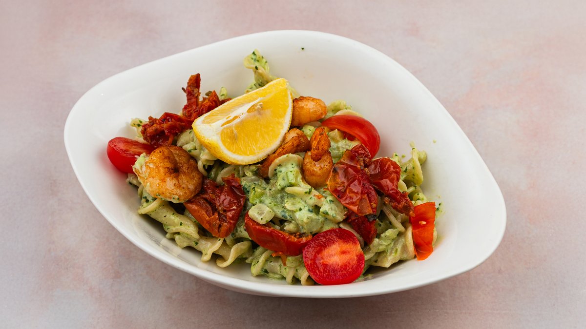 Škampi 70gr, Vapiano bosiljak pesto, pavlaka i tvrdi italijanski sir, maslinovo ulje, mladi spanać, čeri paradajz, muskatni orah, crni luk, so i biber.