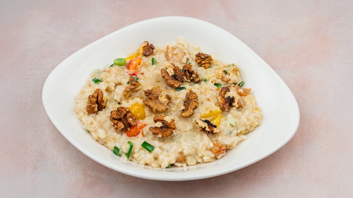 Pileća prsa 70g, Arborio pirinač, aromatična gorgonzola sa orasima, pavlaka, maslinovo ulje, mladi luk, paprika babura, so i biber.