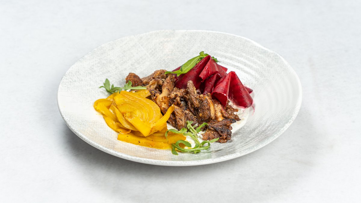 Marinirani komorač u kurkumi, kajdžun bukovača, marinirana cvekla, pesto sos