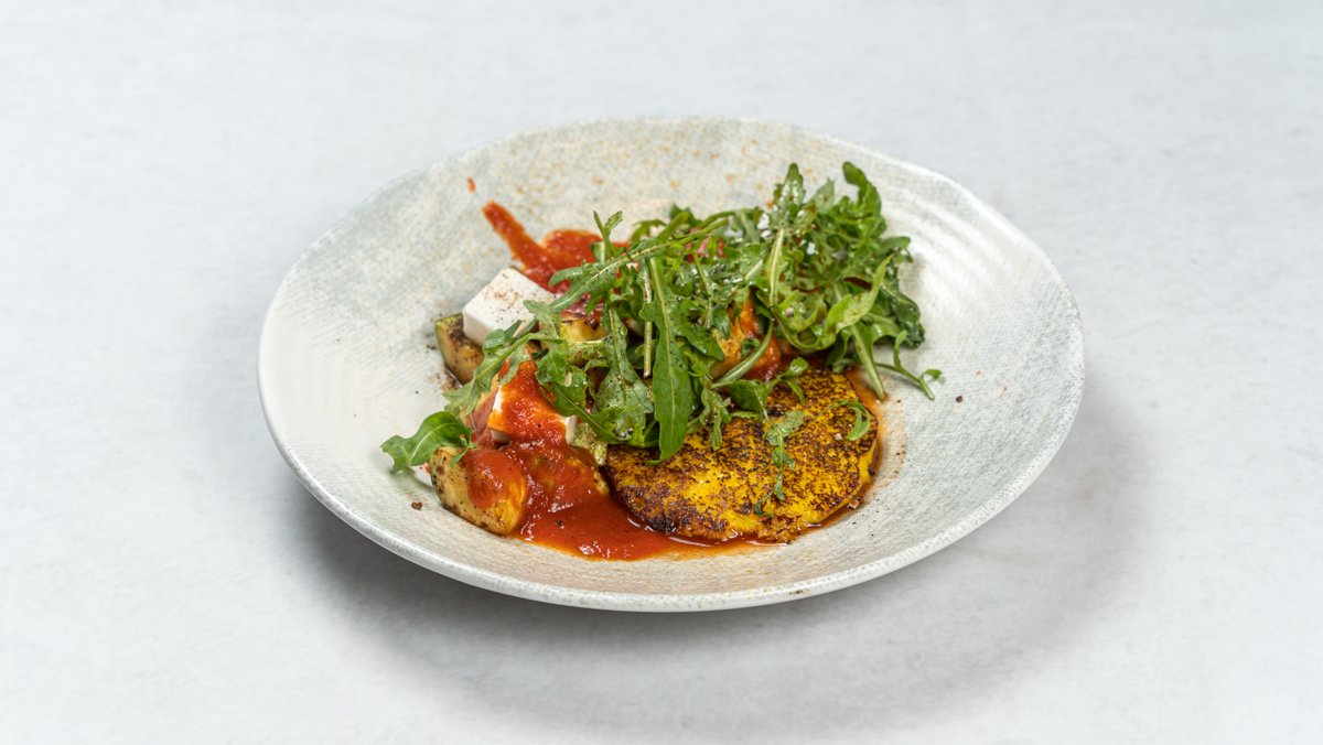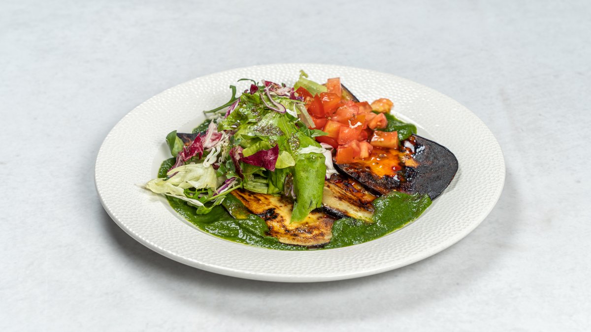 Patlidžan, sweet chily sos, krema od spanaća i suncokreta, sezonska salata, zatar, hleb