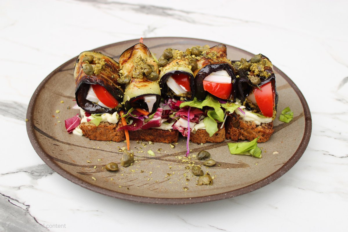 patlidžan, kokos sir, paradajz, kapar, pesto, rukola, bezkvasni hleb
