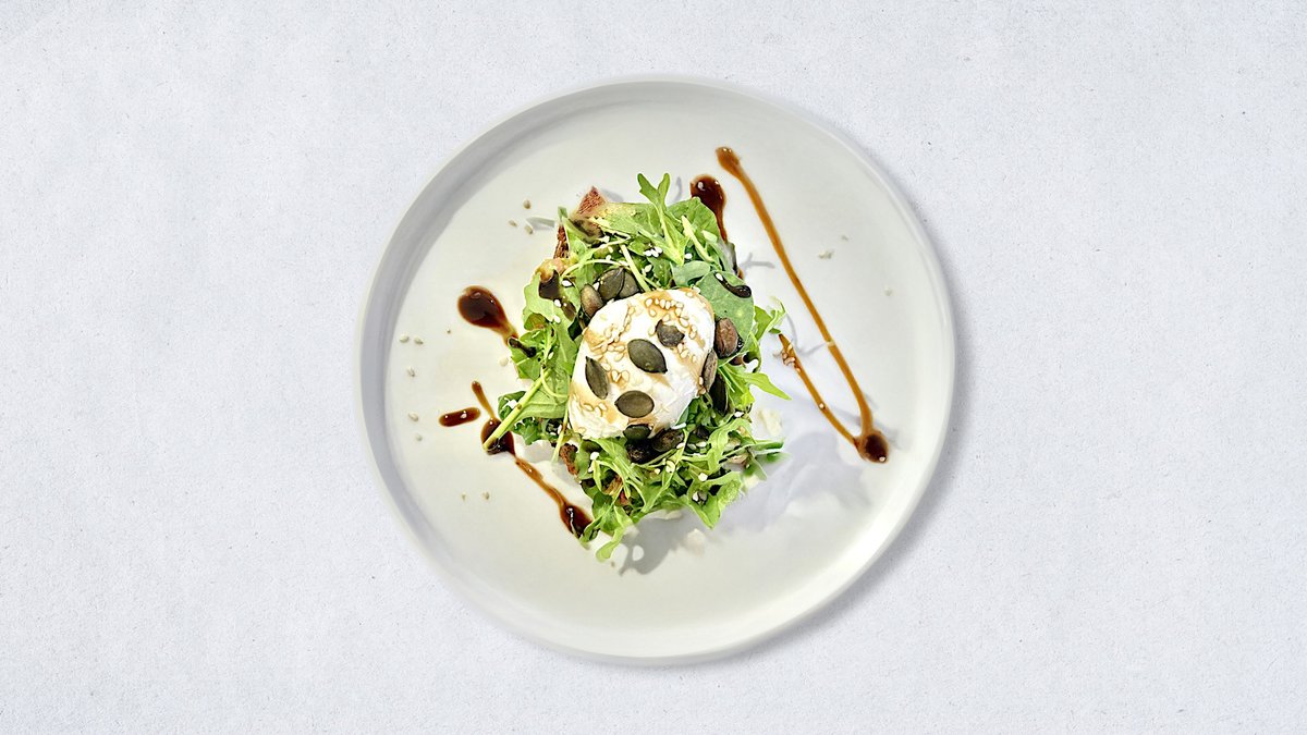 Dark bread with added almonds and hazelnuts, cream cheese, arugula, spinach, baked tomatoes, artichokes, balsamic cream, microgreens