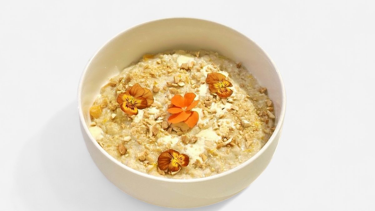 Oatmeal, honey, pumpkin, cinnamon, cream, milk, butter, Callebaut white chocolate, baked cashews