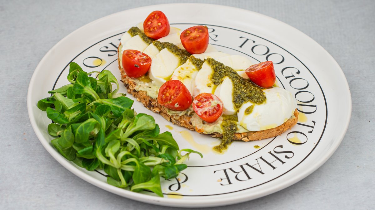 integralni tost hleb, sirni namaz sa pestom, mocarela, čeri paradajz, rukola/matovilac