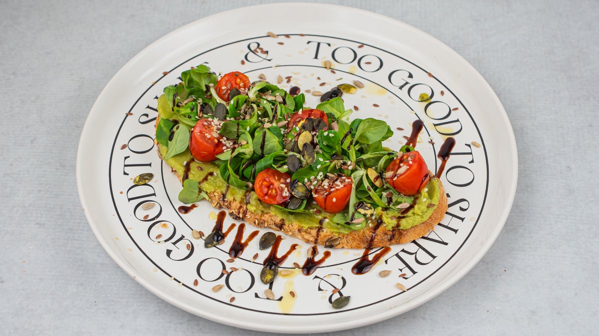 integralni tost hleb, avokado pire, rukola/matovilac, čeri paradajz, miks semenki, aceto krema