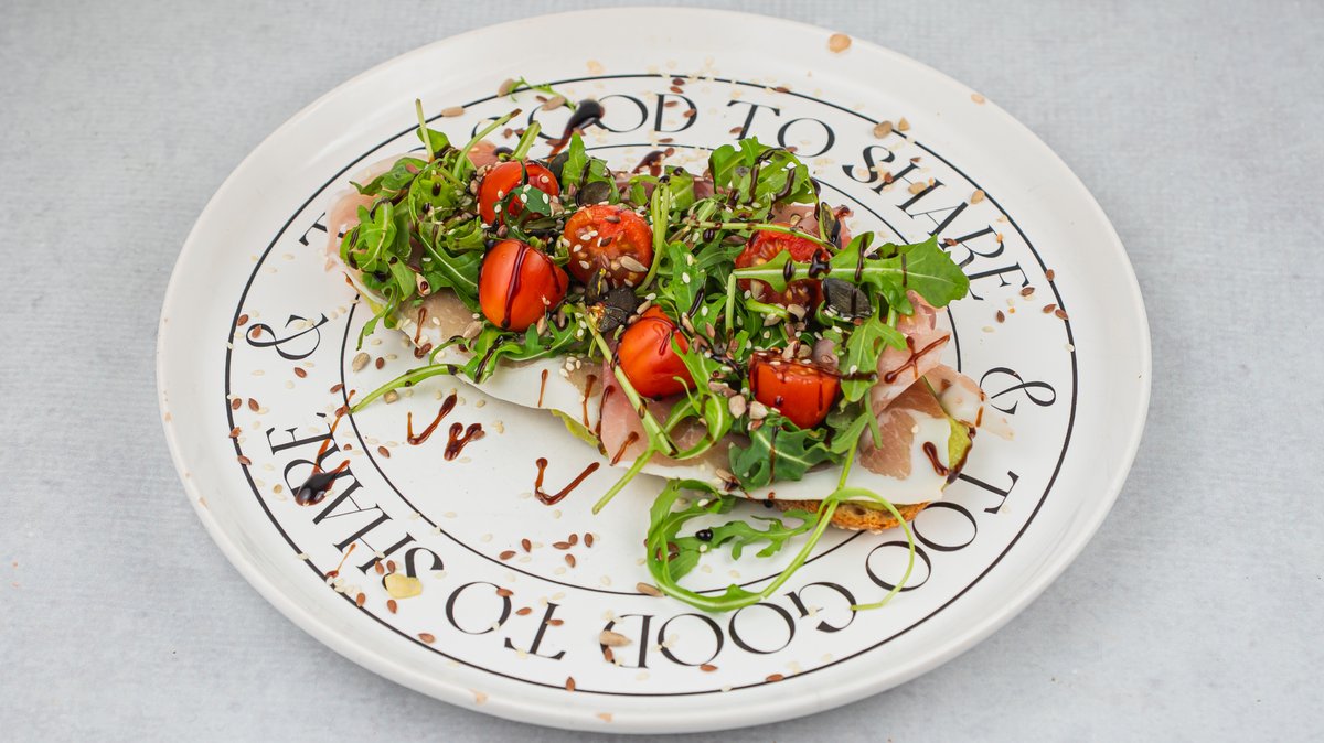 integralni tost hleb, avokado pire, pršuta, rukola/matovilac, čeri paradajz, miks semenki, aceto krema