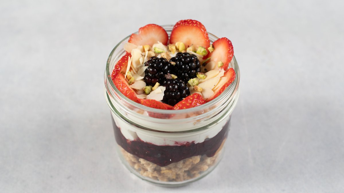 granola, grčki jogurt, domaći džem bez šećera, puter od pistaća, sezonsko voće