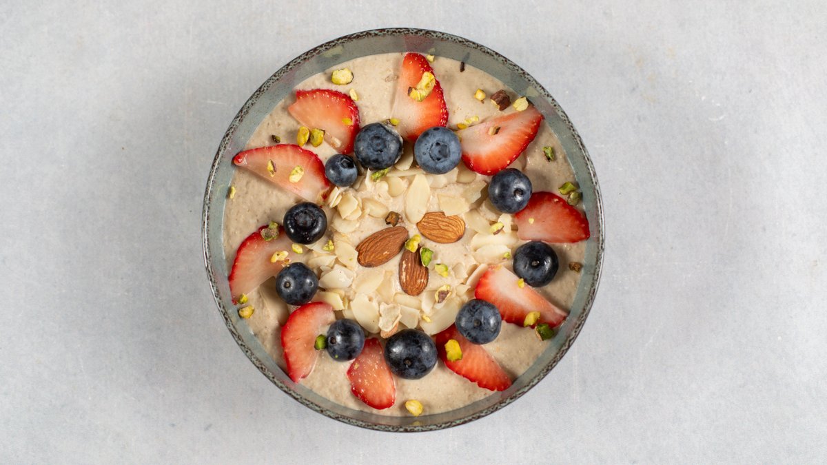 organsko bademovo mleko bez šećera, biljni protein sa kokosom, kikiriki puter, med, banana, sezonsko voće