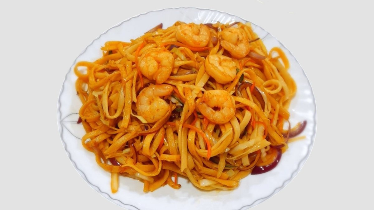 52.Prženi rezanci sa škampima 虾仁炒面 Fried noodles with shrimps