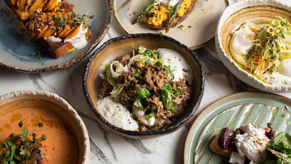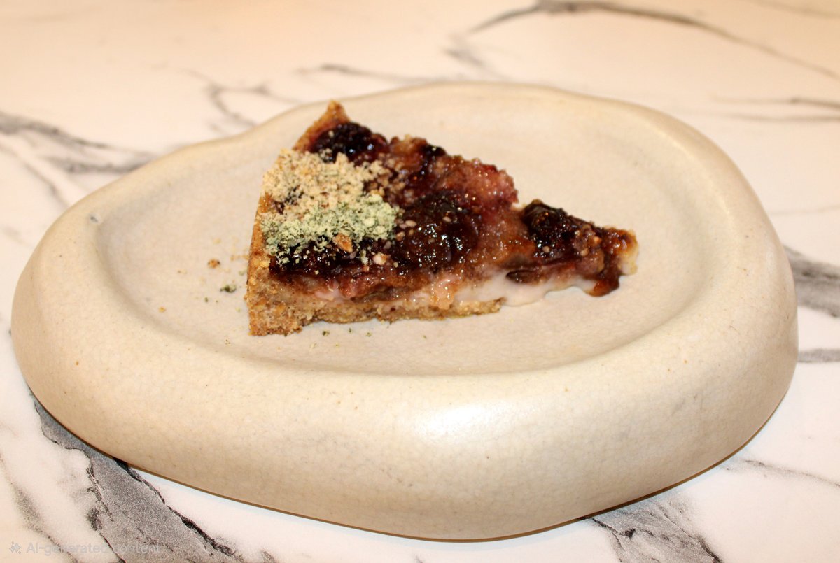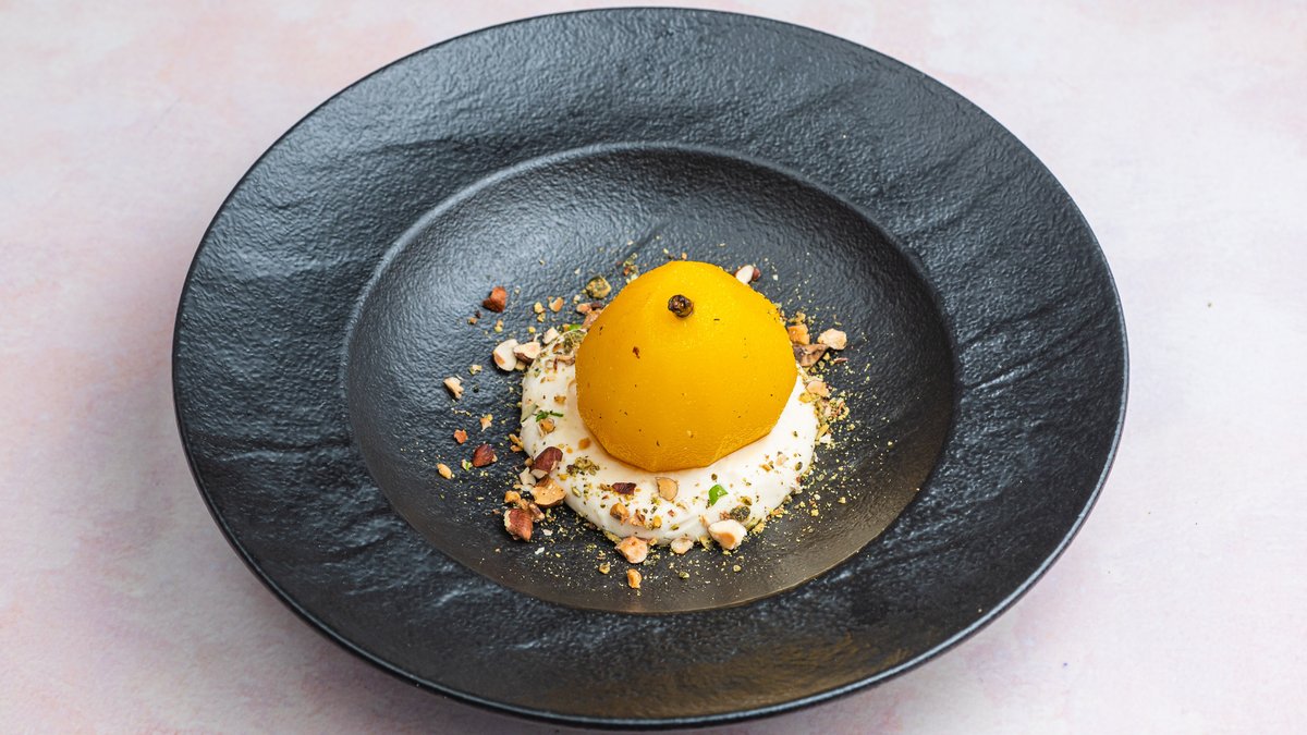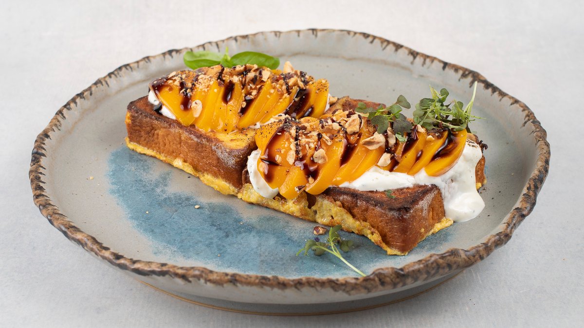 brioš prženica, namaz od jogurta sa medom i majčinom dušicom, marinirana breskva, biber, lešnik i aćeto krema