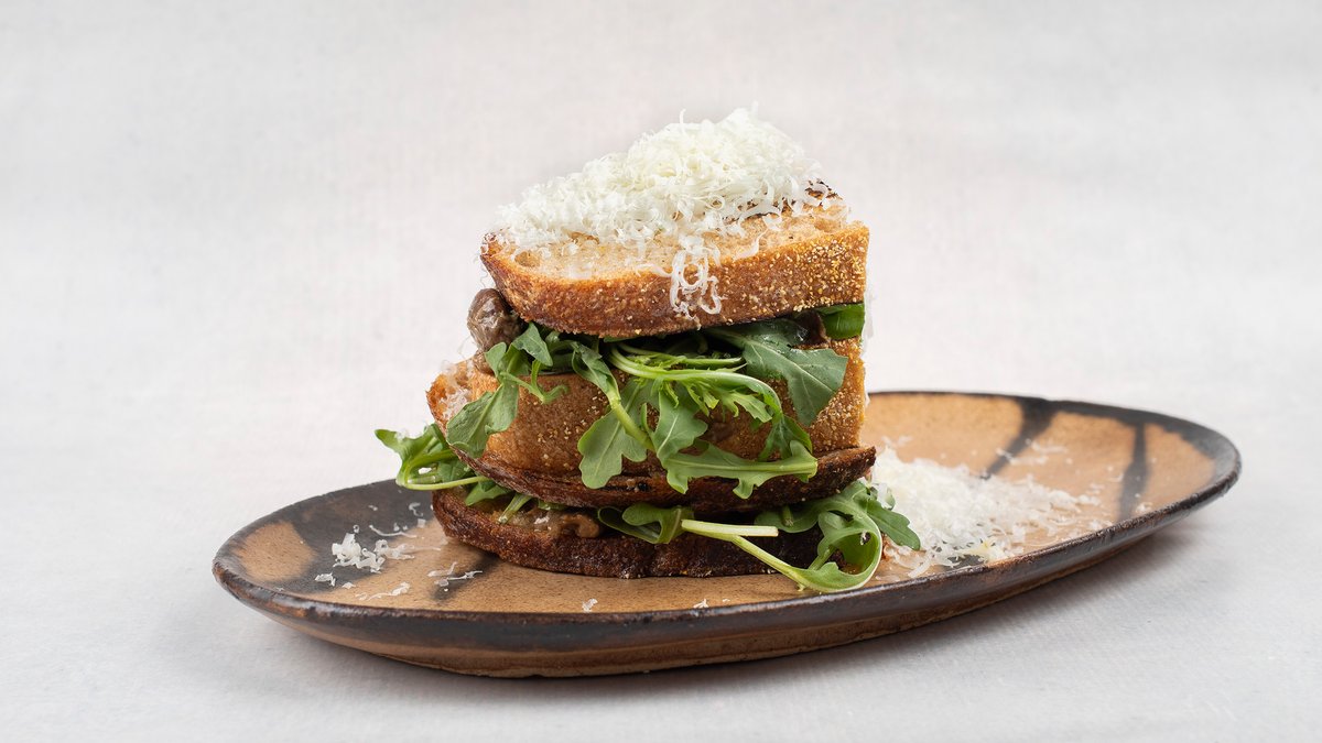 sendvič sa beskvasnim hlebom, punjen šumskim pečurkama i rukolom, sa rendanim gostiljskim sir