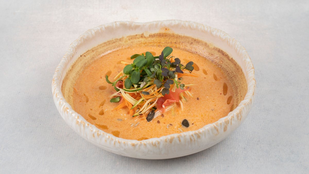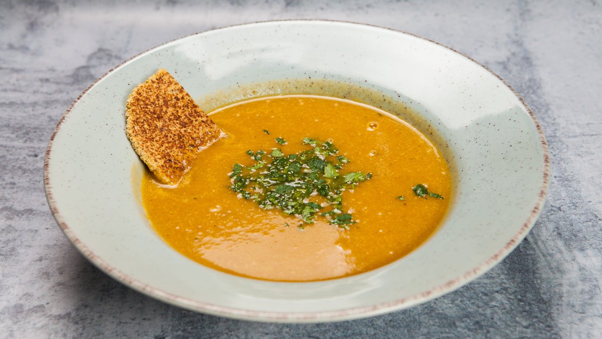 supa od đumbira sa biljnim mlekom, grilovano povrće, bukovača, luk i čili paprika