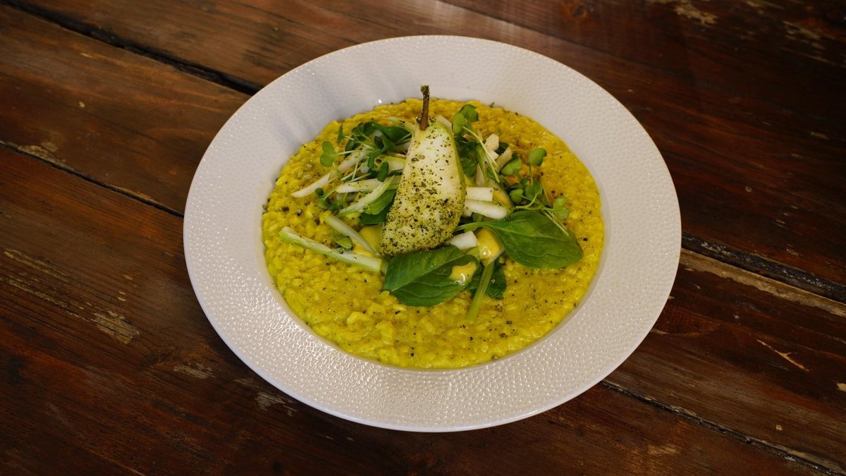 al dente arborio pirinač, kurkuma, celer list, kruška, spanać