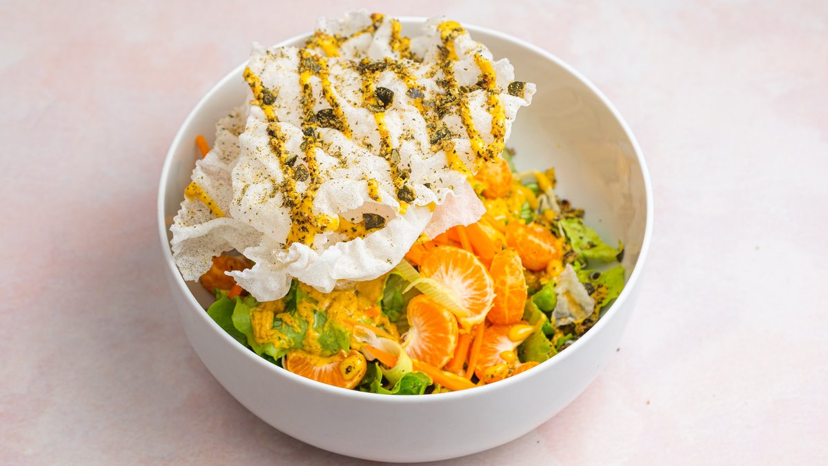 miks salata, agava-senf dresing, lešnik, komorač, pirinčani čips, breskva