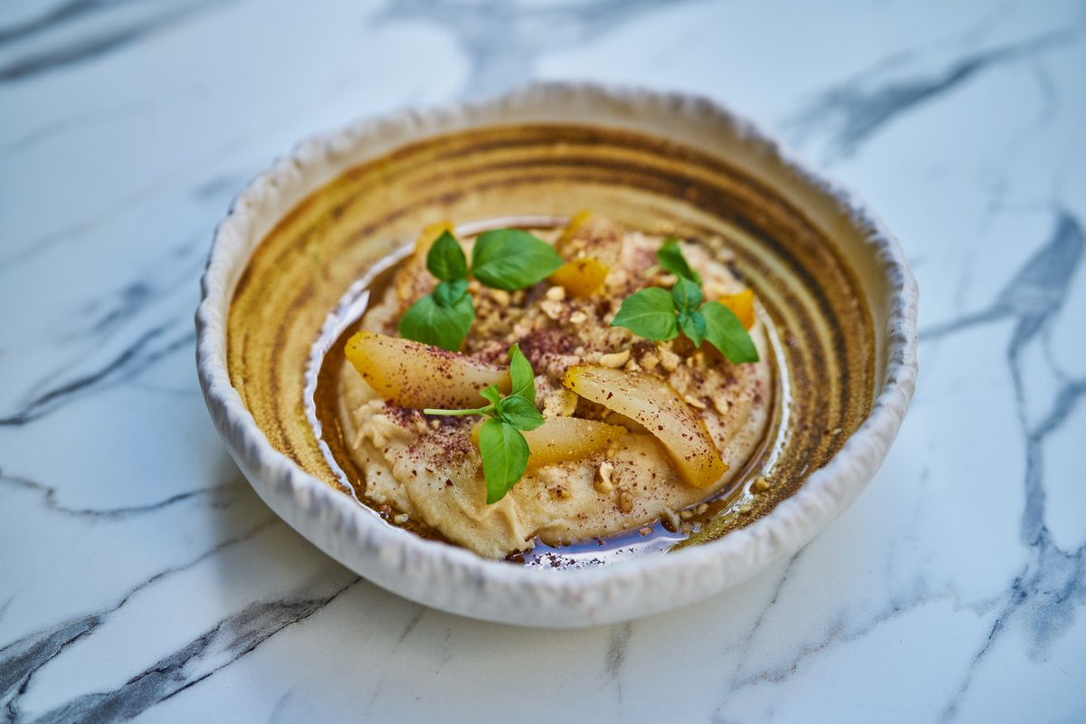 kruška kuvana u belom vinu i kurkumi, krem od bele čokolade, lešnik
