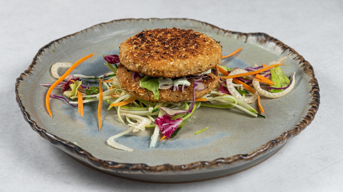 grilovani plavi patidžan u slatko ljutom sosu, sos od spanaća sa suncokretovom kremom, mix zelenih salata, za' atar, maslinovo ulje, hleb