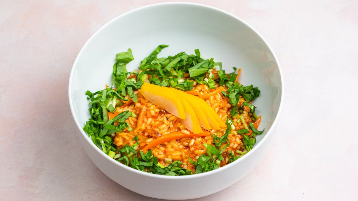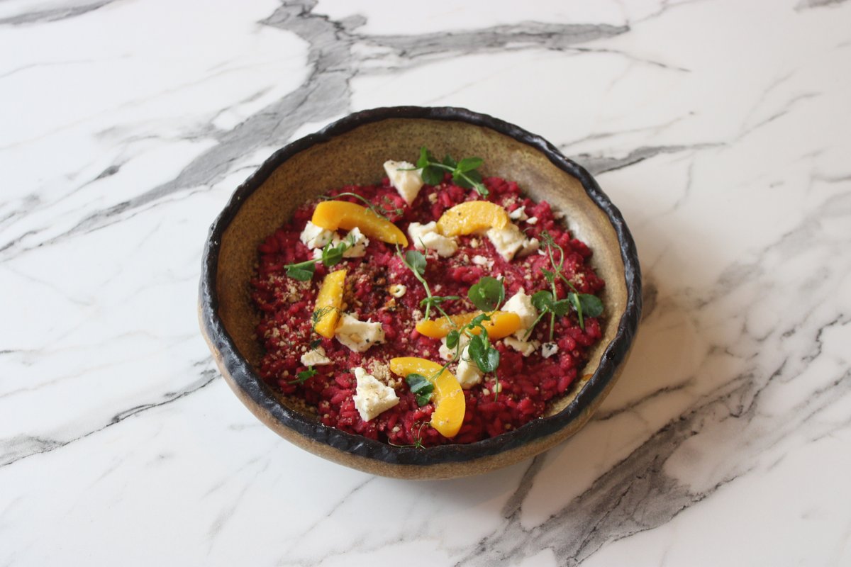 al dente arborio pirinač, cvekla, breskva, kokos sir sa plesnima, lešnik, šoju soja sos