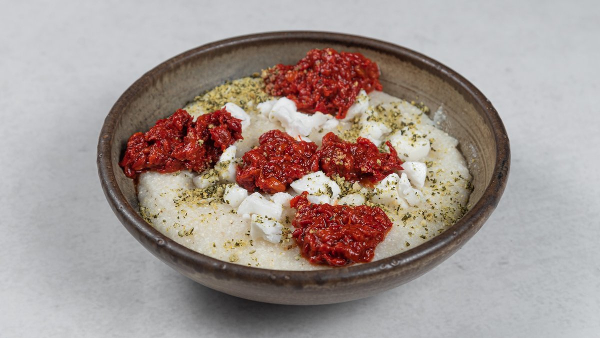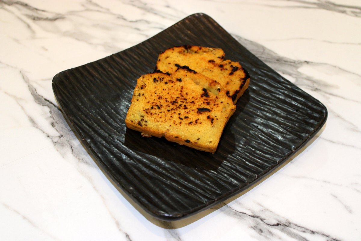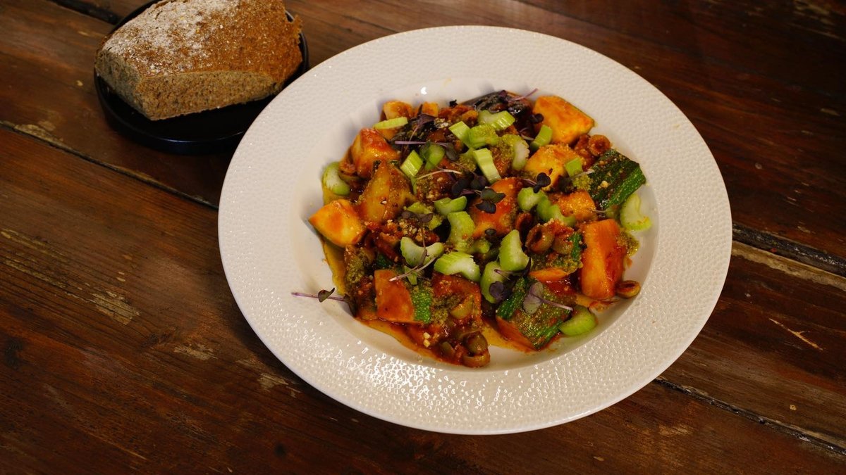 grilovane tikvice sa kokos sirom u paradajz sosu preko kukuruznog hleba, masline