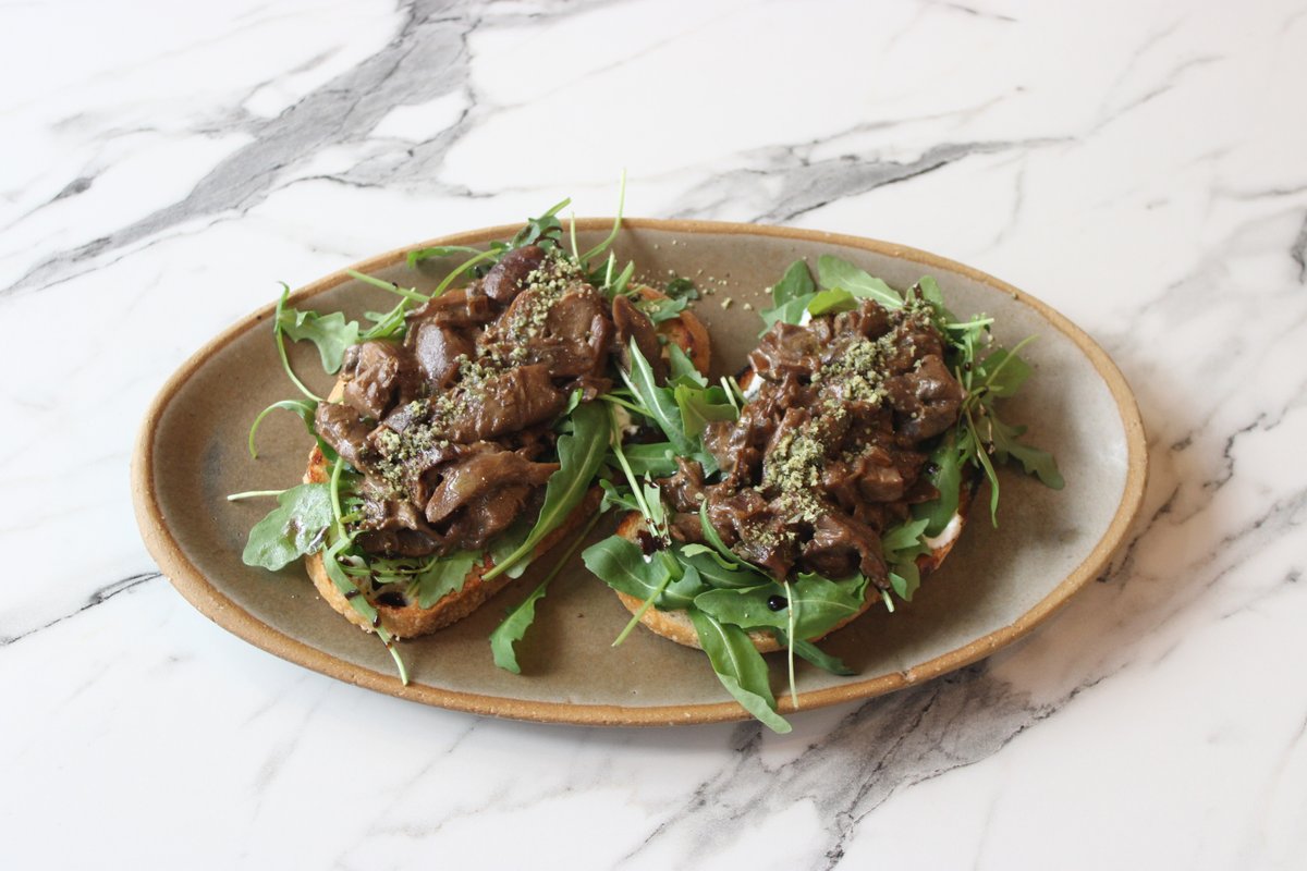 sendvič sa beskvasnim hlebom, punjen šumskim pečurkama I rukolom, sa rendanim kokos sirom