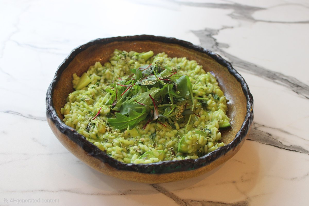 al dente arborio pirinač, tikvica, špargla, spanać, grašak, potaž od brokolija, veganski puter, cips od tikvica