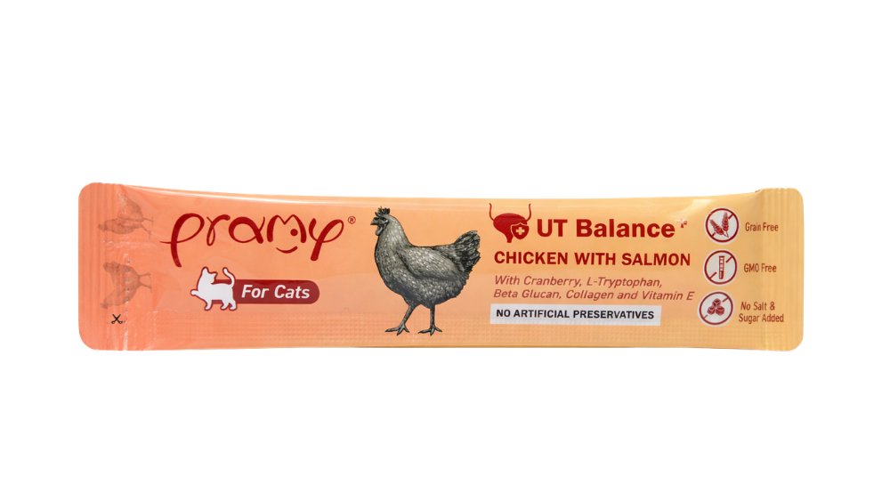 70,00 RSDPramy UT Balance+ sosić poslastica za mačke Piletina sa lososom 14g – podrška urinarnom sistemu 🐱🧡
