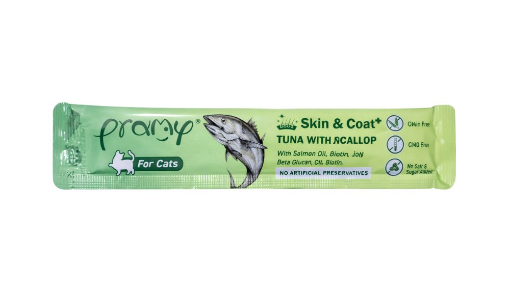 70,00 RSDPramy Skin & Coat+ sosić poslastica za mačke Tuna sa ukusom jakobovih kapica 14g – podrška zdravoj koži i sjajnom krznu 🐱✨💚