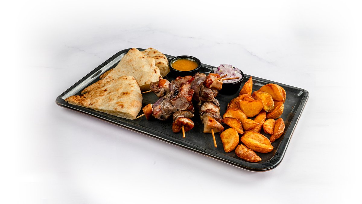 Ražnjić od ramsteka 125g i dimljene piletine na štapiću 125g, domaćinski krompir 100g, senf-med sos, luk, somun