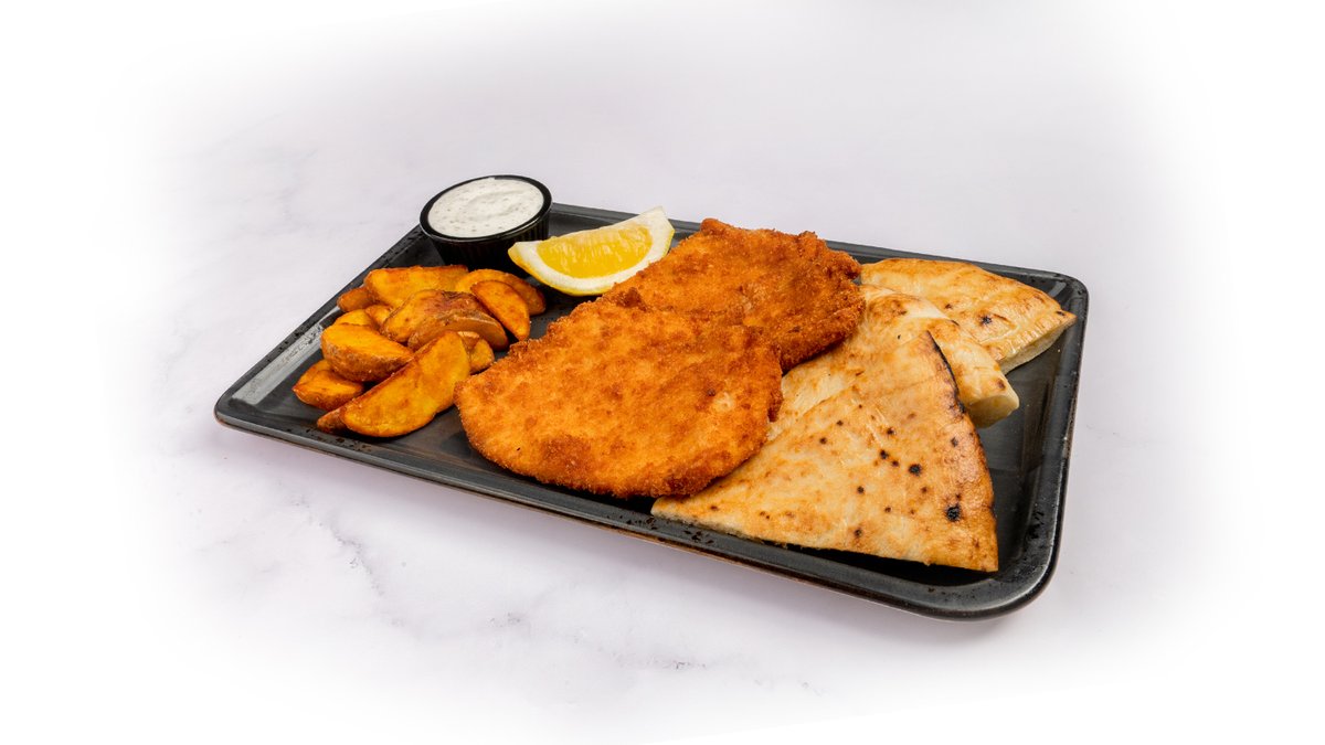 Hrskavi pileći file 250g, domaćinski krompir 100g, tartar sos, somun