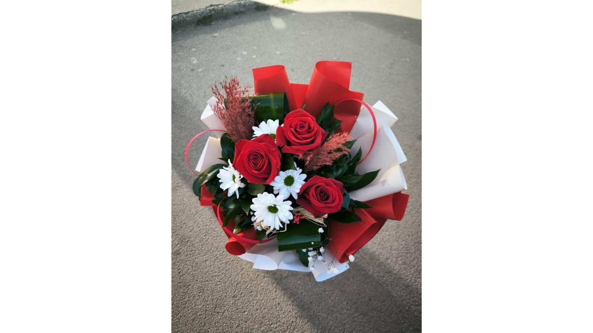 Tri ruže u buketu, sa propratnom dekoracijom i zelenilom