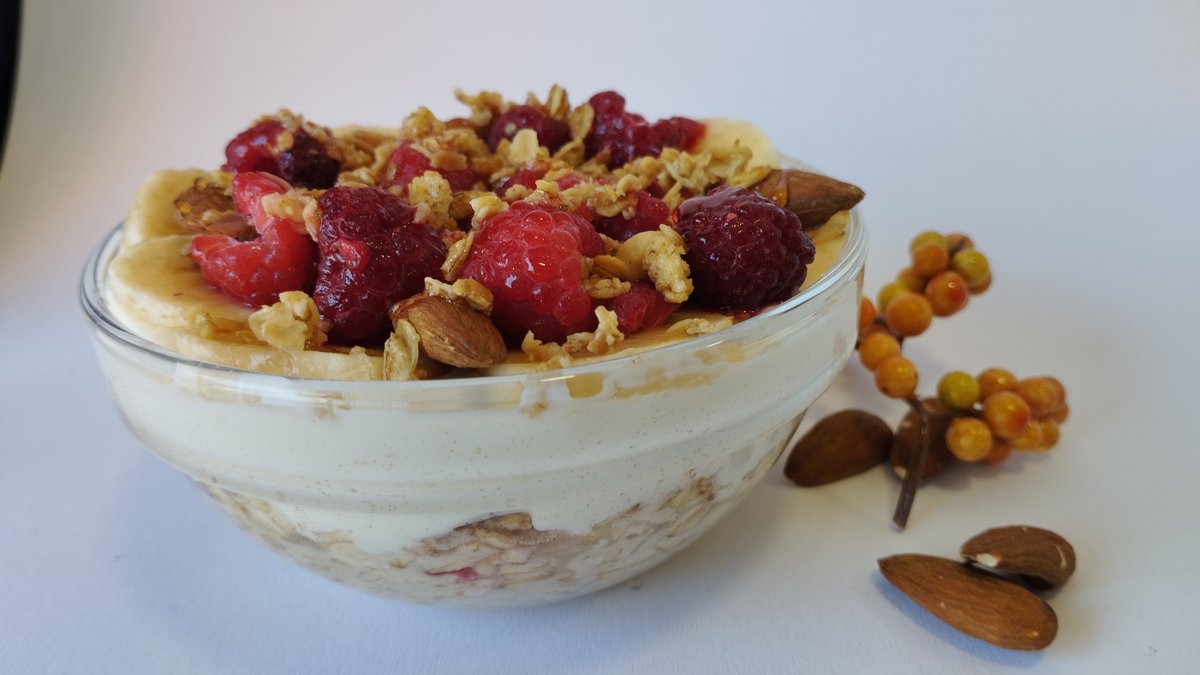 Ovsene pahuljice u bademovom mleku, čia seme, grčki jogurt, banana, malina, badem, med, granola