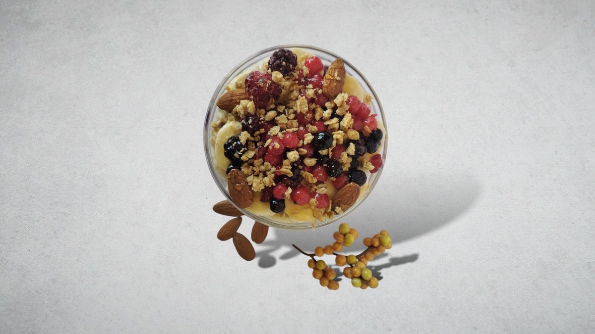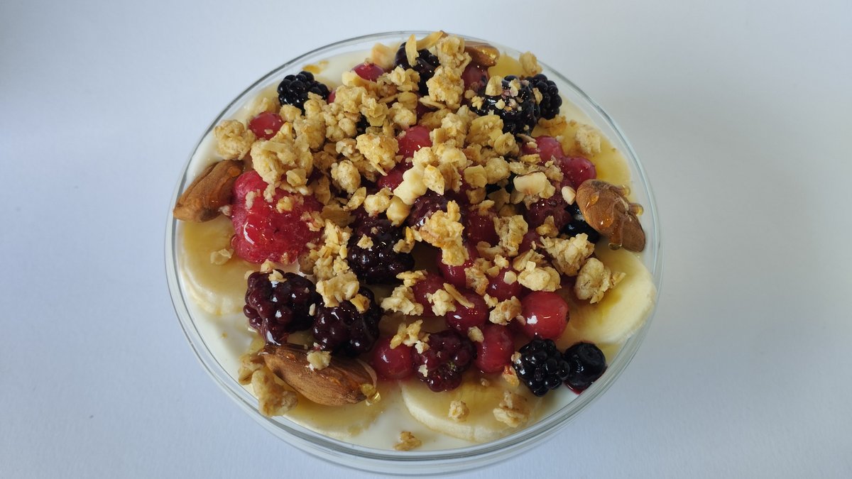 Ovsene pahuljice u bademovom mleku, čia seme, grčki jogurt, banana, voćni mix, badem, med, granola.
