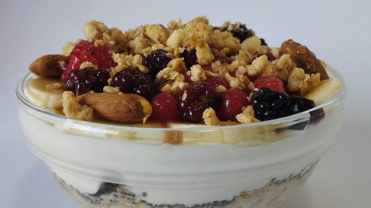 Ovsene pahuljice u bademovom mleku, čia seme, grčki jogurt, borovnice, kikiriki puter, badem, granola