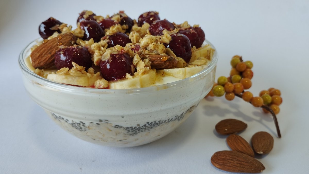 Ovsene pahuljice u bademovom mleku, chia seme, grcki jogurt, banana, visnja, badem, med, granola.