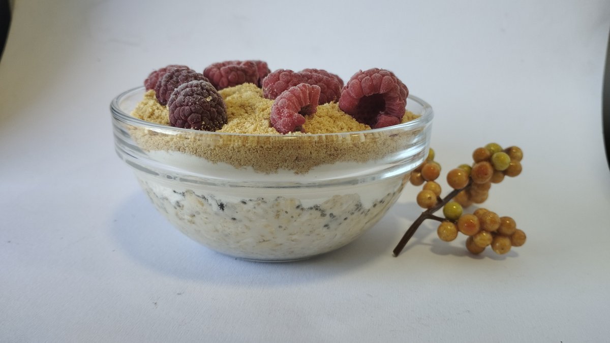 Ovsene pahuljice u bademovom mleku, čia seme, 30g whey proteina, plazma, maline