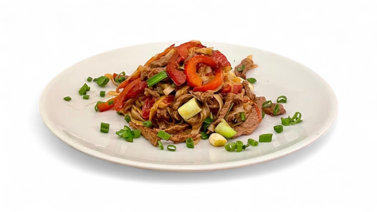 pšenične nudle, ramstek, paprika, mladi luk