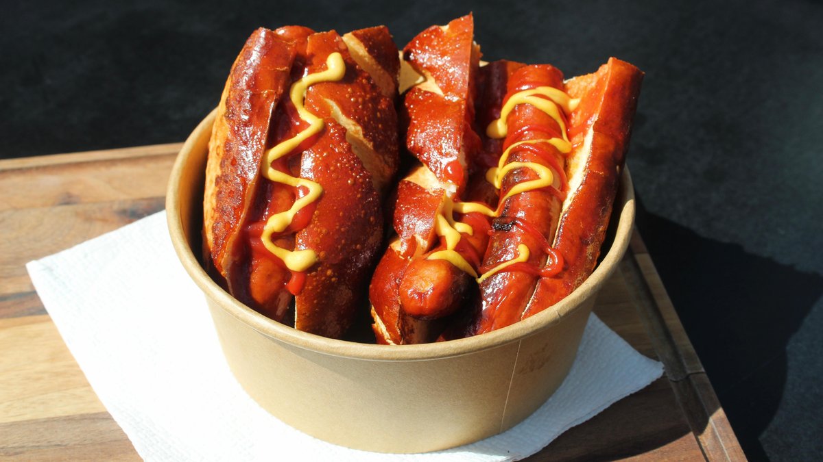 Svinjsko i goveđe meso sa specifičnim ljutim ukusom, wedges, bavarsko pecivo, kečap, senf