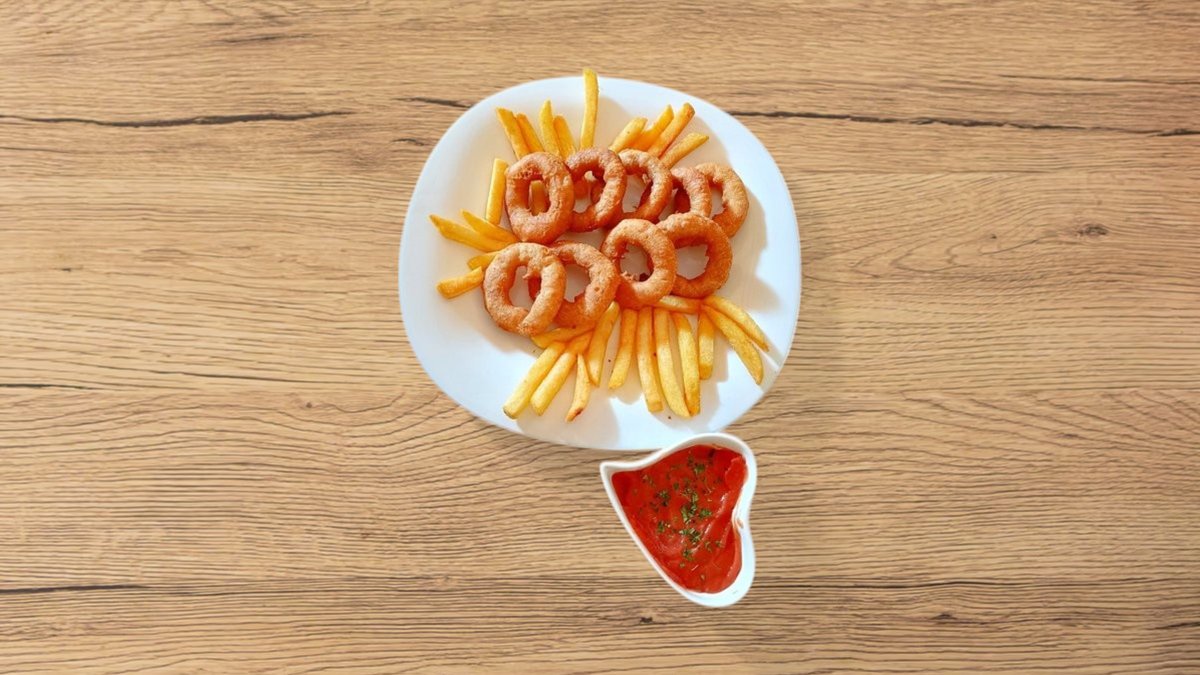 Uživajte u hrskavim lignja kolutićima od 200 g, serviranim sa 100 g zlatno pečenog pomfrita. Idealno za ljubitelje ribe.