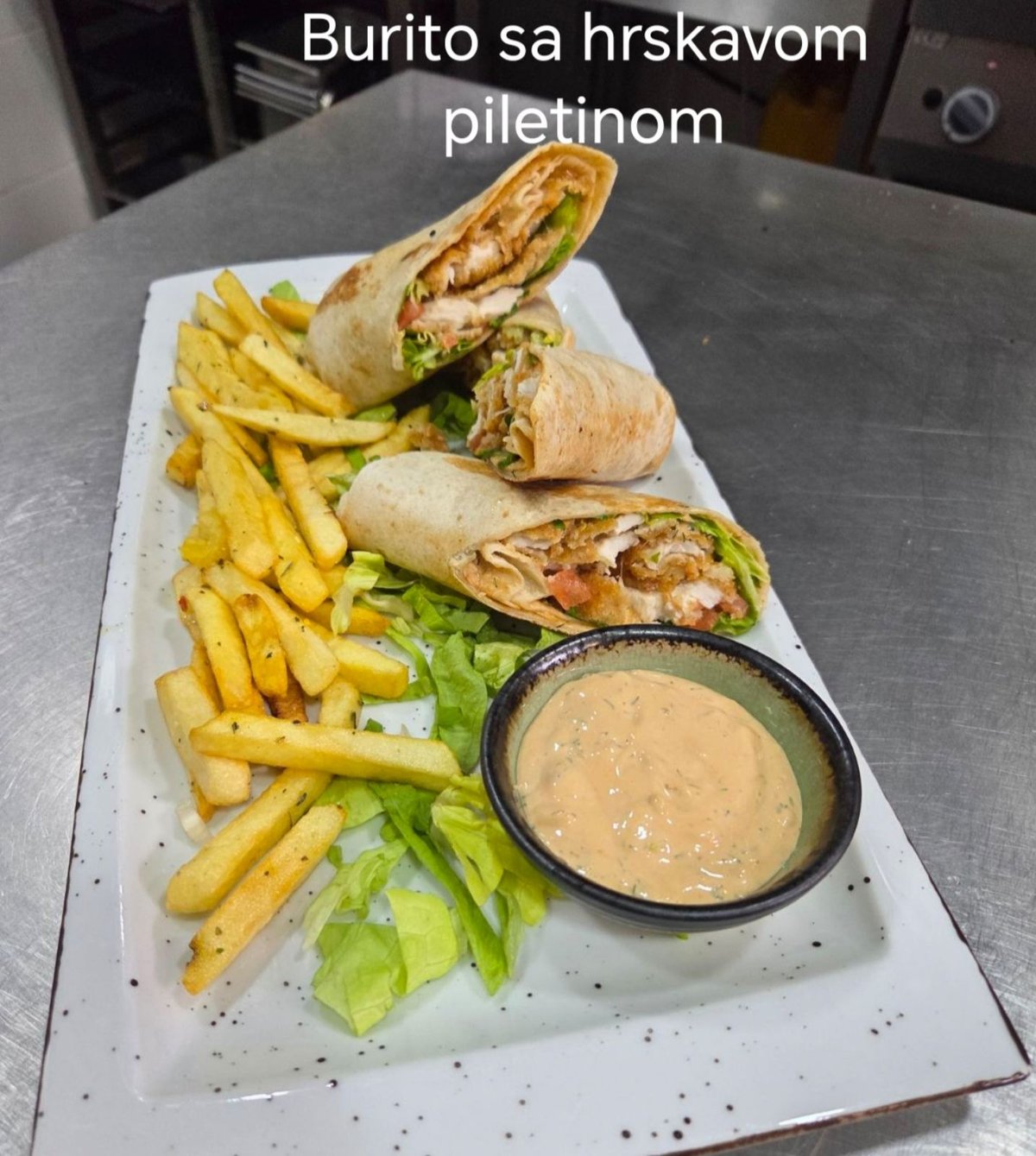 Burrito sa pohovanom piletinom,lukom,zelenom salatom,burito sos i pomfritom.