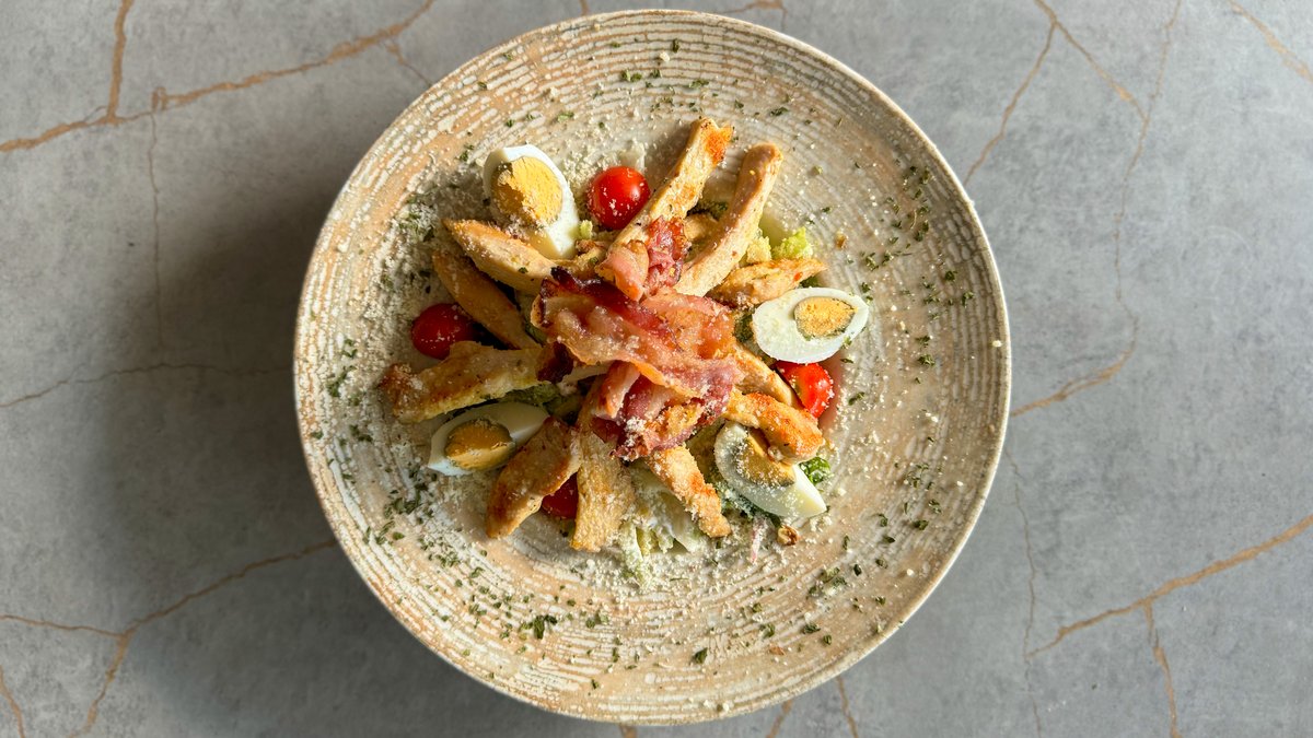 Pileći file, miks zelenih salata, dresing, pančeta, slanina, parmezan, krutoni, jaja