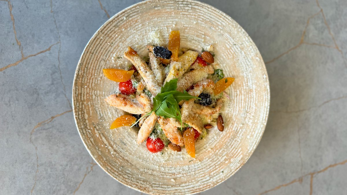 Ćureci file, mocarela, miks zelenih salata, čeri, miks voća, bademi, krutoni, dresing, parmezan