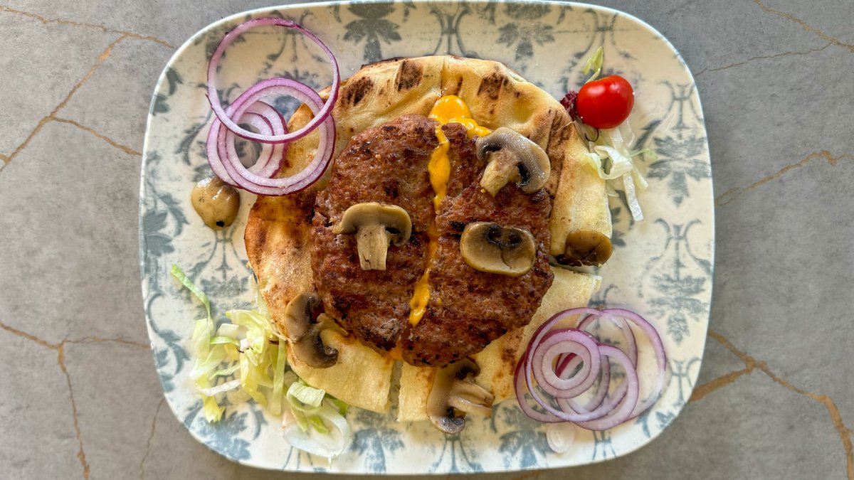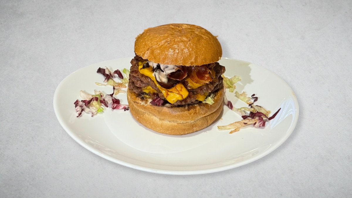 Juneće meso, čeder sir, pančeta, burger sos, ajsberg salata
