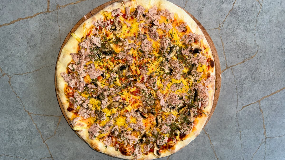 Pelat, posni kačkavalj, šampinjoni, crveni luk, tunjevina, bosiljak