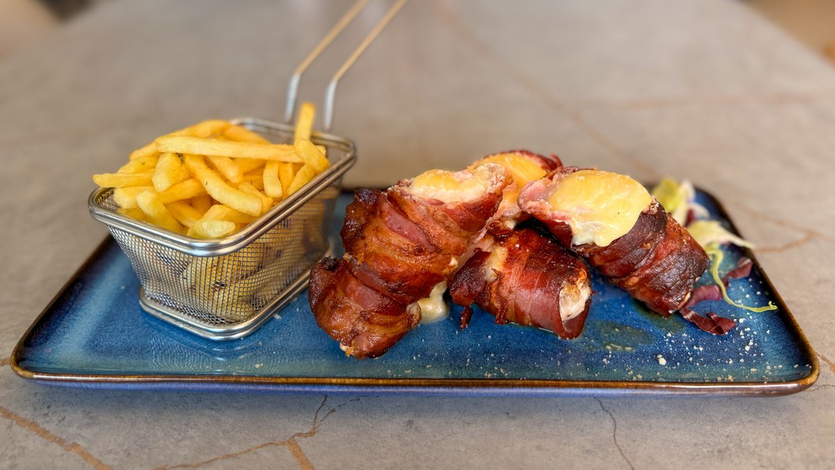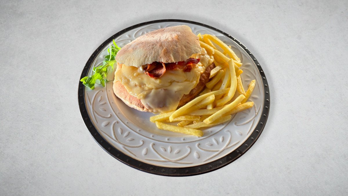 Pileći file, šunka, kačkavalj, krastavac, pančeta, pomfrit