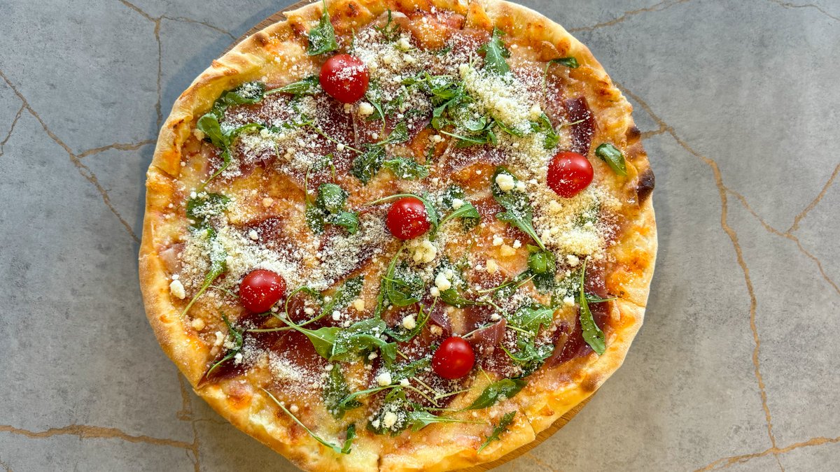 Punjeni rub, pelat, kačkavalj, njegoški pršut, mocarela, rukola, čeri, parmezan