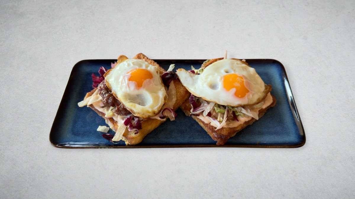 3 crostina, 3 jaja, njegoški pršut, mocarela, paradajz, pesto sos