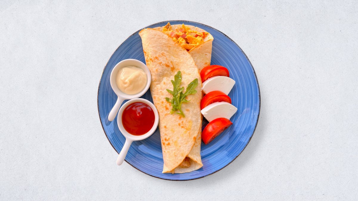 Tortilja, jaja, slanina, šampinjoni, feta sir, paradajz, kečap, majonez